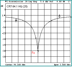 - Graph depicts sharp HQ Notch with >25dB rejection at 94.1 MHz (Fo)