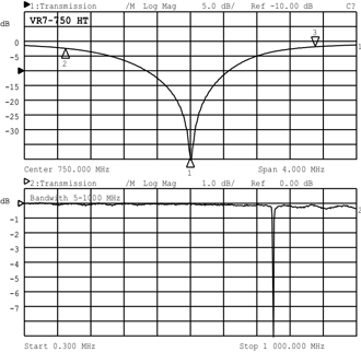 Sharp UHF tunable notch tested at Fo 750 MHz. Signals at and beyond 748.5