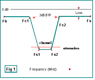- Closest frequencies (or channels) to pass: least loss, or -3dB, - Fc1 & Fc2